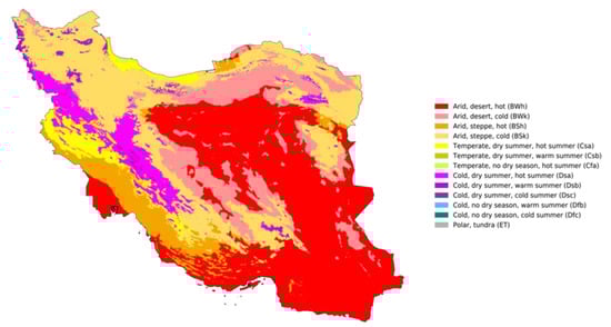 Map of Iran with details of the geographic location and the climate zone classification of all meteorological stations according to the Köppen climate classification.