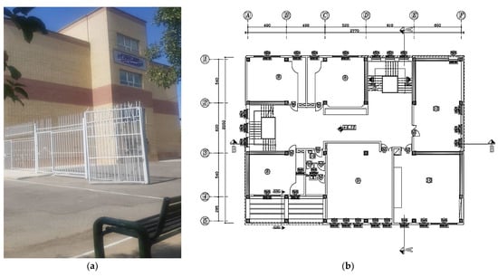 The building had three floors, with three stories above the ground and one story under the ground. Table 1 shows the key design data of the building envelope. The total gross area of the building was 2132.84 m2, the height of the underground and ground floor was 3.2 m, and the height of the first and the second floor was 4.4 m. Figure 6 illustrates the first-floor plan as well as the east view of the studied building.