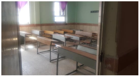 UPVC windows and a wooden door were included in each classroom, office, kitchen, and other related rooms. Figure 7 shows the classroom view. T8 (25 mm diam) fluorescent halo phosphate was used as a lighting system. A VPH-10S2S ventilator was used for the toilet and kitchen in each story, and the number of air changes per hour (ac/h) for this ventilator was 10.29.