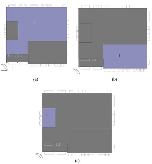 All of the calculations were performed using DesignBuilder and EnergyPlus. To make a net-zero energy building, PV panels were installed based on the DesignBuilder’s assumption. Considering PV panels with 1.939 m2 each and 18% efficiency, it was possible to install 107 panels in area 1 oriented to the south, leading to an installed area of 207.473 m2, 54 panels in area 2 oriented to the south, which provided 104.706 m2, and 15 panels in area 3 oriented to the south, which provided 29.085 m2. These panels were installed every 2.65 m to avoid shading on other panels. The suitable spaces between panels were chosen, as shown in Figure 10, based on the selected orientation. The designed PV system was simulated using DesignBuilder.