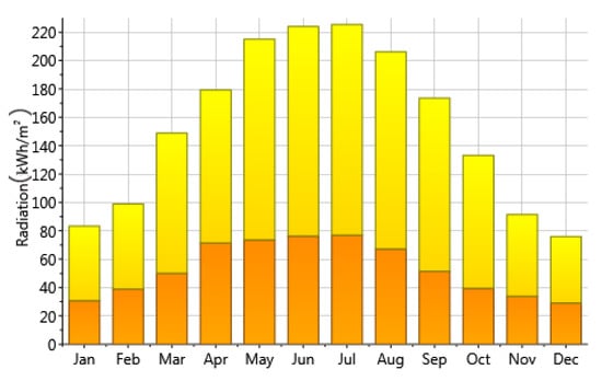 Of all climatic variables, the focus was on global horizontal solar radiation, relative humidity, and dry bulb temperature, as these elements can be effective in terms of thermal comfort, energy consumption, and the design of PV panels [37]. A comparison was then made between the base scenario and the 2080 scenario, which clarified the change in the abovementioned variables. This study mainly took into account the predictions of outdoor temperature and solar radiation. Achieving the most energy savings and the least energy consumption for installing solar panels, local shading for four main directions, and lighting control were added to the model. Solar radiations were extracted by the METEONORM software 8.0.4 and are shown in Figure 11. Then the model was ready to install solar panels. In the second phase, panels, which provide 341.264 square meters, were installed on the roof. The panels had a 45-degree slope to achieve the best performance.