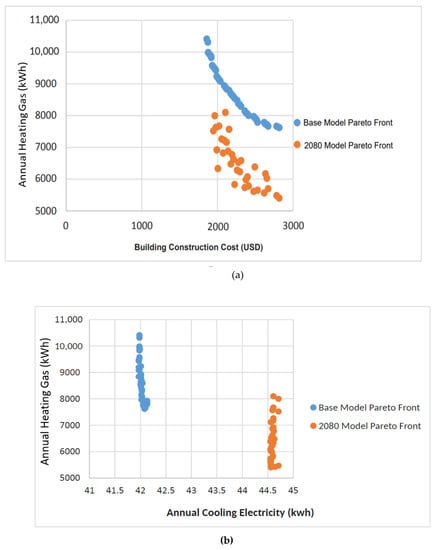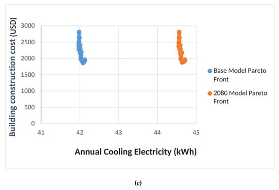 All of the graphs in Figure 12 represent the results, and each point represents one simulation. The color of the points shows various measures of the Pareto frontier based on the relevant criteria (present and future weather files). The base model is also depicted in these graphs to provide the possibility of comparison.
