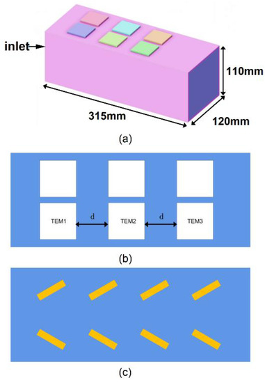 Thermoelectric power generation model: (a) thermoelectric power generation simulation model; (b) module spacing; (c) internal spoiler.