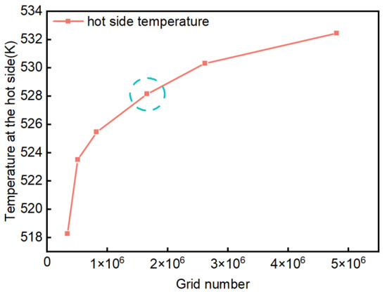 In the present study, six different grid numbers were selected. Simulation analyses were carried out for each module under the conditions of an inlet gas velocity of 30 and an inlet gas temperature of 678 . The relationship between the number of grids and the temperature of the hot side of the module is shown in Figure 2. Taking the simulation accuracy and the time required for the simulation into consideration, the grids were divided based on the method in the circled dotted line. Thus, the number of grids was 1,658,970.