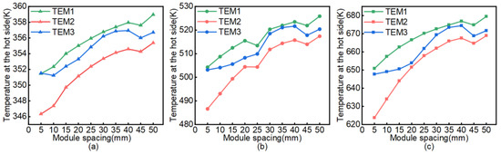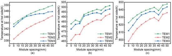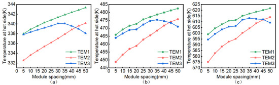 We set the total number of modules at six, the size of which differed. The first columns of modules were fixed, and the modules were arranged with spacing ranging from 5 mm to 50 mm in 5 mm intervals. The corresponding simulation calculations were performed under three different working conditions. Due to the symmetry of the model and the relationship between the hot-side temperature and the module spacing, the temperature of the modules’ hot sides is represented by the modules TEM1, TEM2, and TEM3 on the same side.
