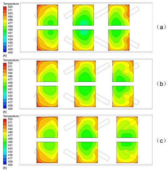 Diagram of the hot-side temperature of the module with a side length of 50 mm: (a) the inlet gas temperature = 436 K; (b) the inlet gas temperature = 678 K; (c) the inlet gas temperature = 864 K.