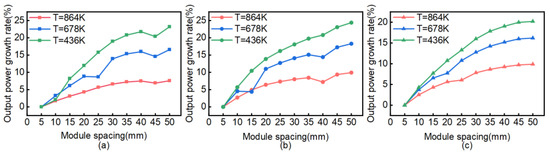 Output power growth rate: (a) modules with a side length of 30 mm; (b) modules with a side length of 40 mm; (c) modules with a side length of 50 mm.
