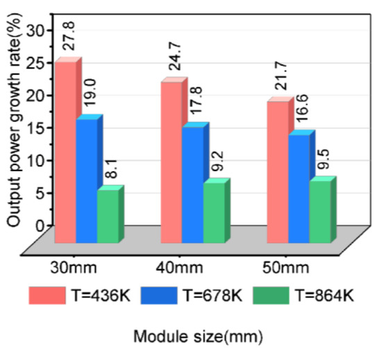 Figure 8 displays the comparative results of the system output power of modules with side lengths of 30 mm, 40 mm, and 50 mm and at a module spacing between 5 mm and 50 mm. When the module spacing was larger than 30 mm, the output power of modules of different sizes witnessed a greater increase under different working conditions. For instance, in Figure 9, when the module spacing was 35 mm, the modules’ output power was not high under low-temperature conditions with a small base value, resulting in a higher growth rate. On the contrary, under high-temperature conditions, the output power growth rate of modules of different sizes was 8~9%. In summary, when the number of modules is set, a reasonable increase in module spacing can increase the output power of the modules.
