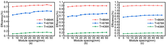 Efficiency is the ratio of output power to absorbed heat. When the heat is constant, the increase in output power will lead to an increase in efficiency. Figure 10 illustrates that the power generation of modules of different sizes changed little with the increase in module spacing. The power generation efficiency is mainly related to the inlet gas temperature. A higher inlet temperature leads to a higher amount of power generation, thereby increasing the corresponding power generation efficiency. The power generation efficiency of modules of different sizes was about 0.15% under low-temperature conditions, from 0.5% to 0.8% under medium-temperature conditions, and from 0.7% to 1.2% under high-temperature conditions.
