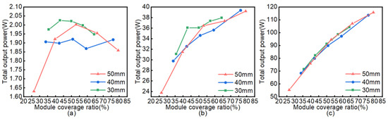 The relationship between module spacing and output power: (a) modules with a side length of 30 mm; (b) modules with a side length of 40 mm; (c) modules with a side length of 50 mm.