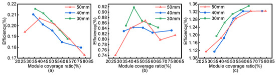 Relationship plot of module spacing and efficiency: (a) modules with a side length of 30 mm; (b) modules with a side length of 40 mm; (c) modules with a side length of 50 mm.