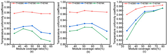 Temperature uniformity coefficient of modules with different coverage ratios: (a) modules with a side length of 30 mm; (b) modules with a side length of 40 mm; (c) modules with a side length of 50 mm.
