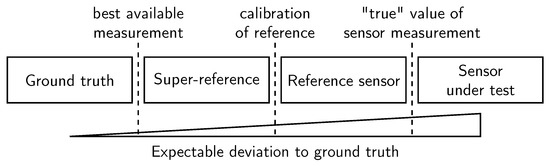 The GT can only be measured with finite accuracy, which we call the super-reference. Thereby, GT is only approximated by the super-reference, leaving a minor deviation to GT. A super-reference is typically only available in limited and controllable circumstances. A reference sensor, however, is optimized for the practical application at the cost of potentially higher GT deviation. To achieve higher trustworthiness in the accuracy of the reference, a super-reference is used for its calibration. Ultimately, when validating sensors, it is of interest to determine measurement uncertainties, which result from the difference between sensor and reference measurement.
