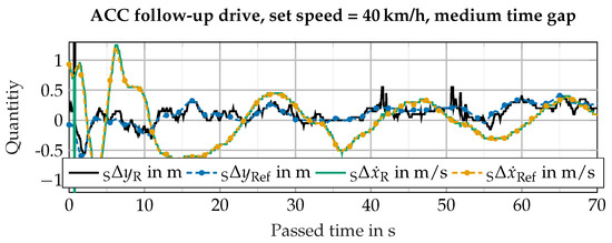 Variation of lateral distance and longitudinal speed between ego car and object of interest (OOI) in an ACC scenario. The left index “S” denotes the sensor coordinate system, “R” the radar sensor and “Ref” the GNSS-based reference system.