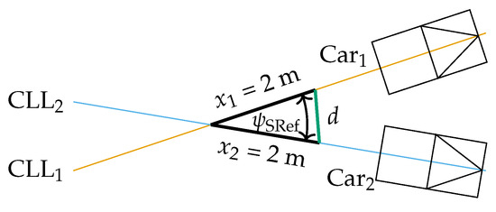 We use two cross line lasers, which are positioned in the same directions as the x-axes of the two cars, to obtain the origin of the straight and . Cross line lasers are aligned so that they point exactly through the centerline of the vehicles. The manufacturer’s logo on the trunk and the shark radio antenna on the roof serve as support points when aligning the lasers. Starting from the intersection of the laser lines, the side lengths of the triangle can now be determined. The edges and are determined using a 2 m long meter stick. Meter rods offer accuracy classes in the sub-mm range, which is considered adequate for the intended use here. This simplifies angle determination by means of the law of cosine because two side lengths are already fixed. The length of d is measured by a measurement tape and is calculated by the three given lengths and the cosine theorem. Five measurements are made within 36 min. The accuracy of this measurement method can be calculated based on the Gaussian error propagation. The values for the error propagation are ± 0.005 m, ± 0.005 m and ± 0.005 m.