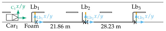 To investigate the absolute accuracy of the reference measurement technique in the dynamic case, the following experiment is proposed: a vehicle passes through three light barriers designated as Lb1, Lb2, and Lb3. These are aligned perpendicular to the roadway. The timesteps at which a light barrier is crossed mark the point in time with zero longitudinal offset between the light barrier and the front point of the vehicle in a light barrier-centered coordinate system. In addition, a foam line is drawn perpendicular to the road. The measurement principle of the super-reference is again completely different to the ADMA and therefore this experiment is suitable as a super-reference. The full measurement setup is illustrated in Figure 5.