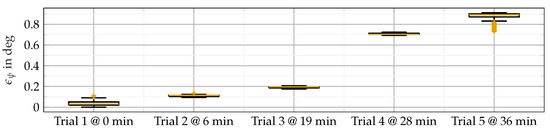 Figure 7 shows the results of our yaw angle referencing experiment. It compares the heading angle as calculated from the law of cosine to the measured value from the ADMA, i.e., . The experiment was conducted five times at various positions and data were collected for around 60 s each. The vehicles were moved only for the purpose of changing position and were otherwise stationary, especially during the determination of the super-reference, which took a couple of minutes. Stationary operating conditions particularly favor the occurrence of yaw angle drift. The drift objectively shows little effect and the deviations are less than 1 deg even after 36 min. It should be noted that the IMU and GNSS fusion system utilizes the dynamic movements of the device. Such a stationary experiment over a long time is challenging for the system. Drift is therefore an expected side effect.