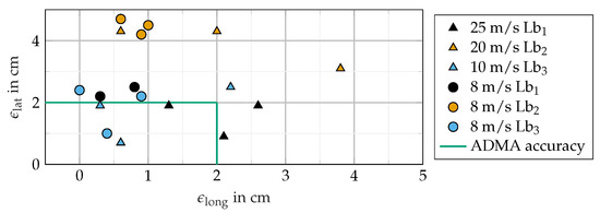 In general, high longitudinal and lateral precision in the three trials of every experiment and light barrier position is achieved. It is to be noted that is larger with a higher speed of the vehicle as it crosses the light barrier. Therefore, low velocities should be used as target velocities to achieve sufficient accuracy or devices with higher sampling frequencies. This is explained with measurement errors due to the light barrier’s time delay = 330 s [22]. This explains the decreasing deviation in the longitudinal direction with decreasing speed, visible by the triangle markers. The delay results in a worst-case error at 25 m/s of