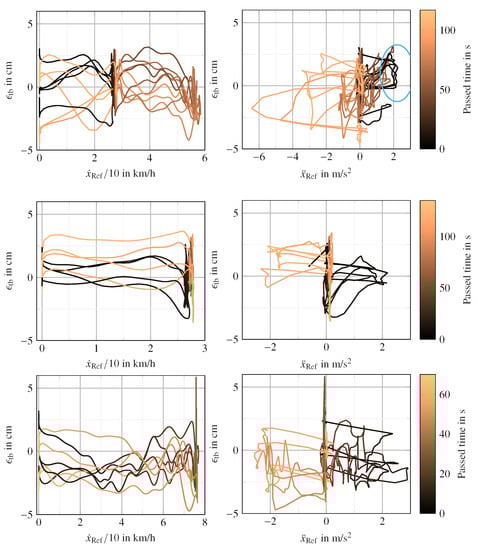 In the left column, vs. velocity is shown for the different velocity profiles mentioned in Section 4.2.4. During areas of “constant” speed, the distance error settles within the accuracy of the measurement devices. In the right column, vs. acceleration is shown. The distance error dynamics show only low sensitivity to acceleration. All trials are depicted and running time is denoted by the line’s color gradient.