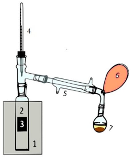 The reactions were carried out following the scheme reported in Figure 1. The reaction system consists of a quartz tubular reactor (2 in Figure 1) charged with 5 g of KL (3) and collocated in an oven (1, Carbolite, MTF 10/25/130, Pocklington, UK). A nitrogen purge was needed to guarantee oxygen removal and to avoid a combustion reaction. Three temperatures, 350, 450, and 550 °C were investigated and kept for a reaction time of 3 h. The reactor was connected to a Liebig condenser (5) that allows the condensation of low boiling compounds. The liquid condensate (L) was recovered in a flask (7) while non-condensable gases (G) were collected in a latex balloon (6). The condensed liquid fraction shows two phases: an aqueous light phase observed on top and an organic heavy phase in the bottom part of the flask. At the reaction end, a solid was still present in the reactor as biochar, and it is referred to as a solid residue (SR). Data reproducibility was evaluated by running each experiment three times, allowing us to assess good data consistency.