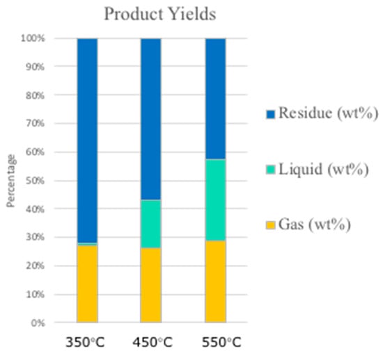 Pyrolysis product yields distribution at 350, 450, and 550 °C.