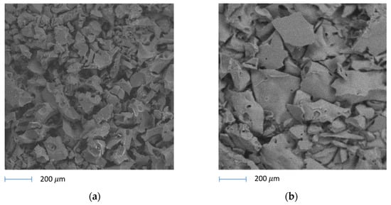 SEM pictures of biochar materials after pyrolysis reactions at (a) 300 °C and (b) 550 °C, respectively.