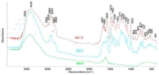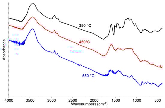FT-IR analysis of SR at 350, 450, and 550 °C.