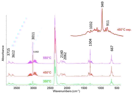 In Figure 7, the IR spectra of gases obtained by lignin pyrolysis are reported. All the spectra show the presence of rotovibrational bands centered at 3715, 3612, 2345, and 667 cm−1 due to carbon dioxide (combination modes, asymmetric stretching, and deformation modes, respectively), at 3011 and 1304 cm−1 due to CH4 (stretching and deformation modes), at 2140 cm−1 due to the stretching mode of carbon monoxide, and at 2062 cm−1 due to carbonyl sulfide (COS asymmetric stretching). Moreover, the expansion of the spectra after treatments at higher temperatures show the presence of ethylene associated with the peak at 949 cm−1 (c) and of propylene (band at 911 cm−1), while the rotovibrational C-O stretching band of gaseous methanol centered at 1032 cm−1 is evident in particular in the spectrum of the gas obtained by pyrolysis at 450 °C. Casazza et al. [34] investigated, at the same temperatures used in this study, the pyrolysis of grape marc, where lignin is present in significant amounts. They did not observe the formation of COS and other sulfur compounds in the resulting gas, where instead nitrogen-containing molecules were found due to the decomposition of protein compounds.