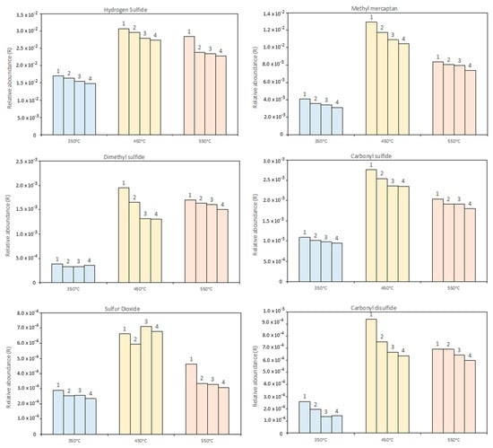 GC-MS analysis of gases detects all the products observed by IR with additional components, which are not detected or detectable in the IR spectrum or have a low concentration in the composition of the pyrolysis gas. Together with small amounts of some light hydrocarbon and oxygenated compounds (i.e., ethanol), in particular, the GC-MS results revealed the presence of other sulfur compounds in G such as CH3SH, CH3-S-CH3, SO2, H2S, and CS2. The evolution of the sulfur-containing species during the reaction time was monitored using a relative abundancy parameter, R, calculated as the ratio between the areas underlying the peak of the considered sulfur species in the chromatogram and the areas of the total compounds in the injection in GC-MS. Figure 8 represents the time–temperature evolution of these compounds, where each histogram represents every GC-MS injection performed during each test. The pyrolysis temperature influences the quantity of sulfur-containing compounds produced, but it does not affect their time evolution. Since gas is mainly produced in the first part of the reaction experiment at each temperature, the R parameter tends to remain constant during the 3 h of the reaction time. However, there are some exceptions: dimethyl sulfide (CH3-S-CH3) and methyl mercaptan (CH3SH) have a drop in the concentration through the reaction time, while the concentration of hydrogen sulfide (H2S) slightly increases. The changes in the H2S content are barely detectable since it is by far the most relevant compound in the gas mixture and its relative abundance parameter is one order of magnitude greater than that of the other compounds. Our data are different from those of Yan et al., who performed a thermogravimetric analysis on Kraft lignin showing hydrogen sulfide as the only relevant sulfur compound detectable, whose production is restricted to a temperature range between 300 and 450 °C [35].