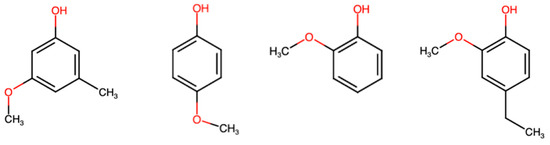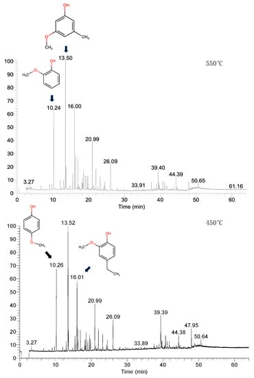 The GC-MS analysis of the liquid extracted after pyrolysis at 450 °C, in agreement with the IR analysis, shows the presence of many oxygenated aromatic compounds, with a large predominance of alkyl- and alkoxy-phenols (Figure 10). Alkyl phenols have been considered as a separated class of compounds since their importance as high-value intermediates can influence the economic feasibility of the process. In the other oxygenated compound fractions, alcohols, ketones, ethers, carboxylic acids, methoxy alkanes, aromatics, aldehydes, and esters have been included. Among them, benzenediols, i.e., catechol, resorcinol, hydroquinone, and some alkyl-derivatives are present. However, sulfur is also present in a few non-aromatic compounds. A small amount of hydrocarbons is also observed. In this fraction, alkyl benzenes, xylenes, and styrene are present. In particular, the main peak corresponds to 3 methoxy-5-methyl-phenol, while strong peaks are also those corresponding to the two isomeric compounds 2-methoxy-phenol (guaiacol) and 4-methoxy-phenol and to 4-ethyl-2-methoxy-phenol. The peaks of these four compounds correspond to more than 65% of all GC spectra in the liquid obtained by pyrolysis at 450 °C, as shown in Figure 11, where the chromatograms obtained from the GC-MS analysis of the CHCl3-diluted bio-oil are reported. The same compounds are also the most abundant after pyrolysis at 550 °C but their amount decreases significantly at this temperature. The reaction liquid composition is completely different from that obtained from the pyrolysis of vegetable oils. Phung et al. [37] studied the conversion of palm oil at 450 °C, and the produced liquid was mainly composed of C8-C16 hydrocarbons. Furthermore, the thermal treatment of plastics (PET, PU, PVC, etc.) led to liquids with different compositions in the function of the used polymer [38].