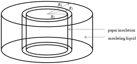 Transformer insulation model, R1—cylinder radius reflecting windings and core, R2 − R1 = paper insulation thickness, R3 − R2 = space filled with electrical insulating liquid.
