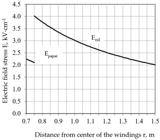 An example of the electric field stress distribution E is shown in Figure 2. With an increasing radius r, the values of the stress E clearly decrease, which is characteristic of the distributions of electric field stress in concentric cylinder systems. In paper insulation, the values of E are lower compared to the stress E in the electrical insulating liquid, which is typical for layered-in-series cylinders, with layers differing in electrical permittivity. In the layer with higher permittivity (paper insulation − εr.paper = 4.4), the stress E is lower, and in the layer with lower permittivity (electrical insulating liquid − εr.oil = 2.3), it is higher. The maximum values of the stress E in each layer will be described in detail in the next subsection.