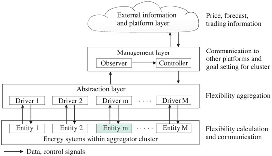 General architecture of data and control signal exchange between entities in aggregator systems and management layer.