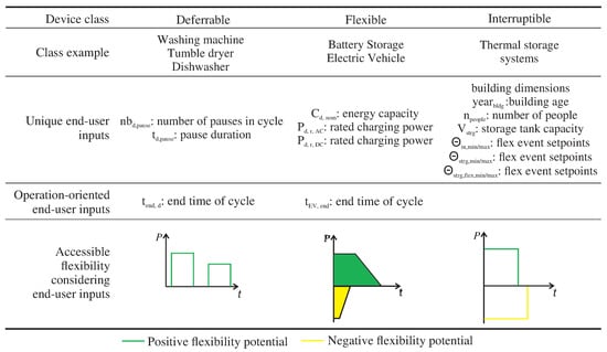The overview in Figure 3 shows the applied device classes. However, the unique end-user inputs indicate a more complex contribution pattern of single appliances when considering additional degrees of freedom. Classic deferrable appliances can contribute as interruptible devices when considering short pauses in operation cycles [31]. With regard to short-term flexibility, flexible and interruptible loads contribute to possible power consumption deviations. The complement of additional loads, such as lighting or cooling devices, is possible.