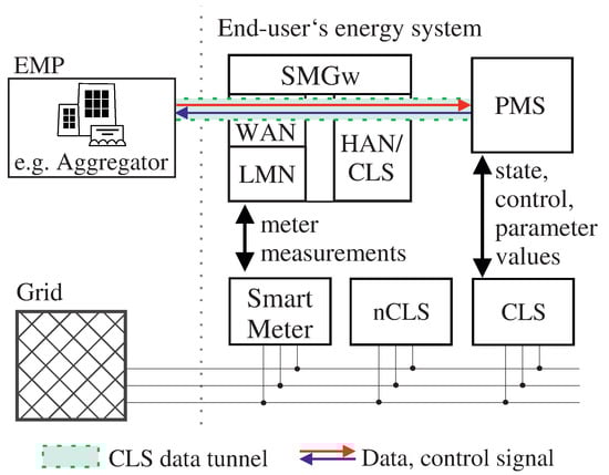 With the integration of an advanced metering infrastructure (AMI) Germany has implemented a highly secure communication device, called Smart Meter Gateway (SMGw), which enables communication and signal exchange between different entities surrounding the AMI [32]. A detailed overview of the infrastructure and related requirements, focusing on aspects of modeling and real-time simulation are presented in [33]. The communication and data exchange is established between the wide area network (WAN), including different external market participants (EMP), the home area network (HAN) with an end-user’s smart and controllable appliances and a visualization interface, and the local metrological network (LMN), consisting of metering devices for electricity. The LMN is also capable of including metering devices for other sectors, such as water or gas. For the communication to smart and controllable devices, so-called controllable local systems (CLSs), the SMGw offers an additional communication channel for a limited and certified set of EMPs. This additional transparent data channel allows the direct communication and data exchange to end-user controllable devices. For energy and power management purposes over a wide variety of different loads or RES, the connection to only one local central management system is beneficial. The information allocated by the local central management system to EMPs is independent from device specific protocols within the HAN devices. Besides this harmonized information allocation, only one device, the management system, has to be configured by the SMGw-administrator as CLS within the SMGw. Other smart and controllable devices are directly connected to the central management device. The proposed implementation is shown in Figure 4. Only CLS directly connects to the local central management system communicate state and parameter values. In contrast, non-CLS (nCLS) only contributes to the overall power consumption without the adjustment potential. By sending signals to the local central management system, the CLS operation is adjusted to met the pre-defined goals. The key parameter to be determined is the accessible amount of power that can be adjusted in the next hours. The need for a highly secure software and hardware architecture in the energy sector, discussed in [12,13], especially when concentrating on the demand side [16], has only been considered in a few cases [17]. With the developed methodology and the integration into the presented architecture, this gap can be closed.