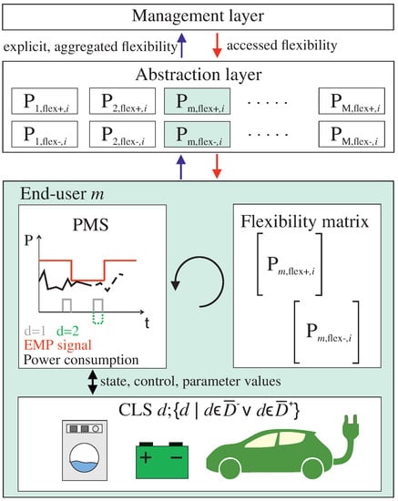 We consider the time of the day represented by I intervals where and M participating end-users with . The power consumption of end-user m in interval i can be calculated according to Equation (2). Whereas is the non-adjustable power consumption, can be monitored and controlled for power adjustments through data and signal exchanges between smart devices and the PMS. Protocols like EEBUS or other protocols can be applied. However, the simple aggregated power consumption of smart devices is not addressable for the entire value, taking into account the specific appliance’s state and the state determining underlying parameters and their future development.