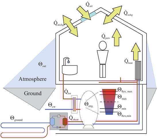 The thermal dynamic of buildings, following the same number of interval I, can be calculated through Equations (9) and (10) for the next step’s inner temperature and the water storage temperature , applied and validated in [33]. The additional parameters stated are the heat gain through windows , the heat gain arising from the heat flow from the hot water storage tank , which is positive for Equation (9) and negative for Equation (10), the heat gain from present persons and the heat capacities of storage tank , and rooms . The values and contain the thermal exchanges with the surrounding air caused by transmission through building components and direct ventilation. The hot water usage is covered by , whereas represents the electrical heater heat gain. The implementation of efficiencies is possible and can be applied to conversion and transportation losses. The needed temperatures and heat exchanges are shown in Figure 6 with a ground source heat pump system.