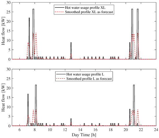 Relevant parameters for the estimation of flexibility are the assumed hot water usage for the next intervals and the heat transmission through the building components. The hot water usage profile is closely linked to the number of end-users in the building. By setting the number of people as PMS end-user input, one of three smoothed hot water usage profiles applied in [33] are implemented as hot water usage forecast . Through overlapping the three hot water usage profiles, a normalized hot water usage forecast profile is generated, which can depict a wide set of household configurations. By using Equation (11) the adjustment factor for each possible household configuration, taking into account the number of people, can be calculated. Different energy demands , for a defined number of people, can be used for the forecast adjustment. Figure 7 shows the original hot water usage profiles L and XL derived from [35] and the applied forecast profiles for PMS calculation with an end-user input for two/three people and four people, respectively.