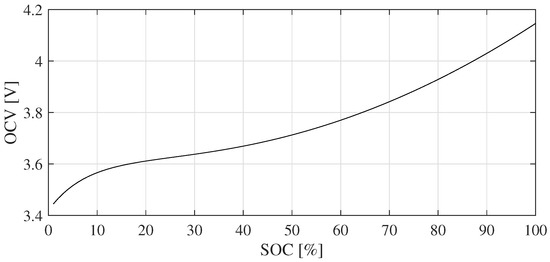 OCV of one cell for the applied battery model to different SOC states for the modeled reference device EV.