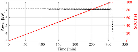 With the knowledge about the current SOC and the corresponding position q within the matrix all future minute-based power consumption can be extracted and used to communicate flexibility potential for the CC phase of the charging process. The measured CC phase for the VW e-Golf goes up to SOC = 100% and is estimated by Equation (22) at 99.1% with an absolute difference of 4 min.