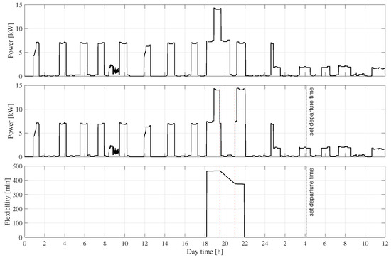 In Figure 11, a flexibility event was chosen by the EMP at the first day of the simulation interval, which includes the EV flexibility potential. The corresponding first row of the flexibility matrix for generation substitute is presented in Equation (27), depicting the positive flexibility matrix for a working day in spring. The flexibility matrix was sent at , which corresponds to 07:15 p.m. The communicated power reduction potential estimated with 7.128 kW was realised with a difference of 70 W. The load adjustment was realised in the communicated manner, without harming the end-user comfort settings, here defined as departure time.