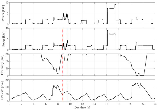 A second flexibility event was chosen by the EMP at the third day of the simulation interval with the help of a flexibility matrix sent at , which corresponds to 08:00 a.m. The third row of the flexibility matrix is depicted in Equation (28), showing a possible event with a duration of 45 min, starting at 08:45 a.m. In Figure 12 the realised flexibility event in comparison with the not realised flexibility event profile is shown. In addition, Figure 12 shows the calculated time until the lower flexible storage temperature is reached, which includes the possible event duration when turning to OFF state. Within the algorithm the maximum duration is set to 150 min, which means a possible extension of the flexibility matrix to entries. The highly relevant value for staying in ON state, shown in Figure 12 leads to possible flexibility events only when higher then 15 min, because only then the heat pump system could be turned to the OFF state. Due to the realised flexibility event the ensuing behaviour of the heat pump system changes compared to the profile without flexibility event. Assuming an increasing implementation of flexibility, usage profiles of devices or end-users influenced by flexibility events should not be used for flexibility evaluations, without knowing the exact flexibility event. Through the possible communication connection to different EMPs or contributions to different aggregator systems, the information about flexibility realisations and profile adjustments should be accessible to a wider spectrum of entities. Without this information, monitored profiles are hardly usable for getting more insight in flexibility potentials in energy systems.