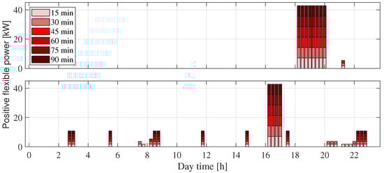 The exemplary value , sent at 7 p.m. for intervals (see Equation (6)), shows a accessible flexibility event starting at ( min) 7:45 p.m. Taking into account Equation (7) the duration can be calculated.