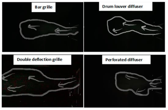- The airflow visualization using smoke tests showed a longer airflow throw in the case with double deflection grille, while the flow in the perforated diffuser case was shorter and highly diffusive. The jet entrainment with the bar grille case was uniform and moderate.