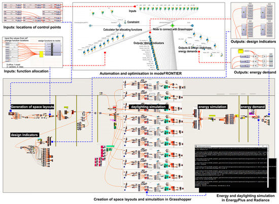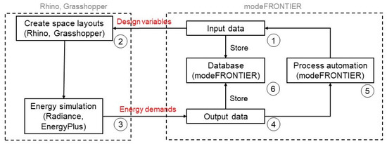 The final step of the computational method entailed an automated iterative loop of space layout generation and energy performance assessment. The process looped generation and assessment, based on an optimisation algorithm or a set of evaluations designed for DOE. As shown in Figure 1 and Figure 2, the input data (i.e., design variables) and output data were used to process automation.