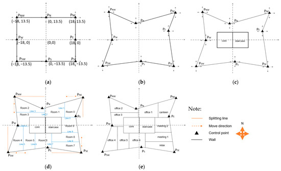 Procedure for generating layouts. (a) Original layout; (b) Changing the layout boundary using control points; (c) Locating the core and staircase in the middle; (d) Splitting the remaining layout into 10 rooms with the same area; (e) Allocating functions to the 10 rooms.