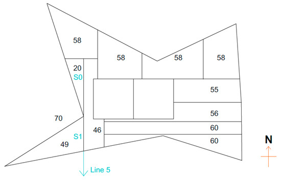 Although the algorithm considered different scenarios with different layout shapes, one scenario was disregarded, as shown in Figure 4: when using Line 5 to split the SW corner, a concave shape appeared and both rooms, i.e., S0 (20 m2) and S1 (49 m2), were not big enough as a single room (58 m2), while the sum of the two rooms (69 m2) was bigger than a room; this situation was ignored in this study.
