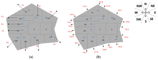 The floor area ratio per orientation (floor-orientation) was calculated based on room area; the orientation of each room was determined based on the orientation of internal walls, as shown in Figure 5a. Taking floor − S as an example, Office-5 and Office-6 faced South in this layout, as shown in Figure 5a. The floor − S was calculated as follows:
