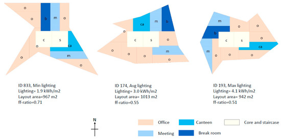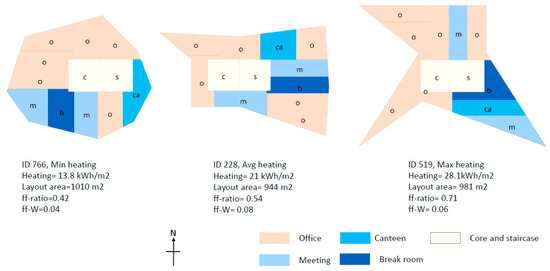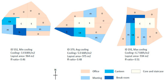 Among all layouts which were generated from the optimisation for minimising cooling demand and also satisfied the layout area constraint, the layout with minimum cooling demand (3.4 kWh/m2) was found and shown in Figure 10, as well as the layout with maximum cooling demand (6.7 kWh/m2) and the layout with average cooling demand (5.0 kWh/m2). By comparing the three layouts, the following conclusions were drawn: