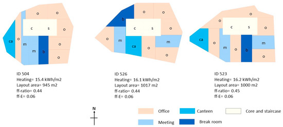 - Comparing different functions defined in this study, the location of offices showed a stronger correlation with the energy demands for the layout than the other functions, followed by meeting rooms, as explained in Section 4.3.2.